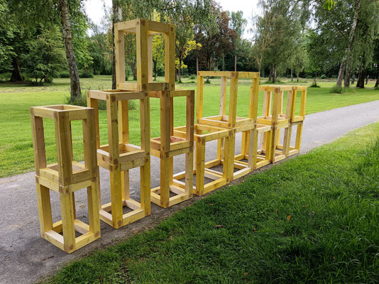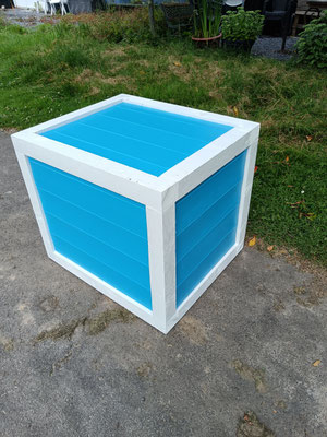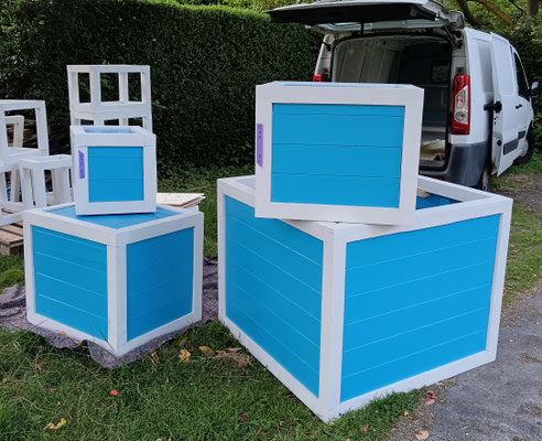 Le cahier des charges : fabriquer des cubes en bois de différentes tailles et couleurs pour le décor d'un parc d'attraction en respectant les codes couleurs de l'établissement. Livraison en Rhône-Alpes.