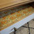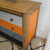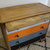 Commode datant des années 1950, en chêne massif. 4 tiroirs. Plateau rétractable. Entièrement poncée, le bois brut a été protégé, les tiroirs ont été peints dans un dégradé du gris au noir, avec une touche pep's orange sur le second. Le fond des tiroirs est tapissé avec du papier peint fleuri vintage.